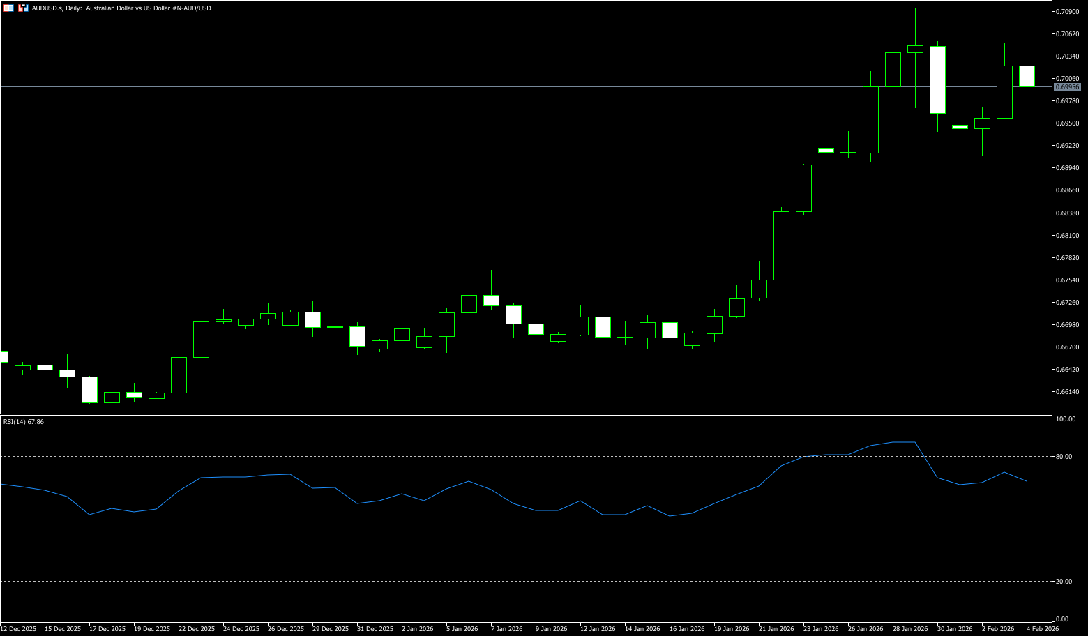 The Australian dollar traded near 0.7000 against the US dollar on Wednesday. Daily chart analysis suggests the pair remains in an ascending channel pattern, indicating a continued bullish bias. The 14-day Relative Strength Index (RSI) is at 71.00; generally indicating bullish momentum, but the momentum has stretched. The Australian dollar rebounded to 0.7094 against the US dollar, its highest level since February 2023, a level previously reached on January 29. A break above this level would support the pair testing the February 2023 high of 0.7158. On the downside, key support lies at the 10-day simple moving average (SMA) at 0.6969. A break below this level would lead to further declines and expose the support zone at 0.6900 (psychological level) and 0.6899 (14-day SMA).