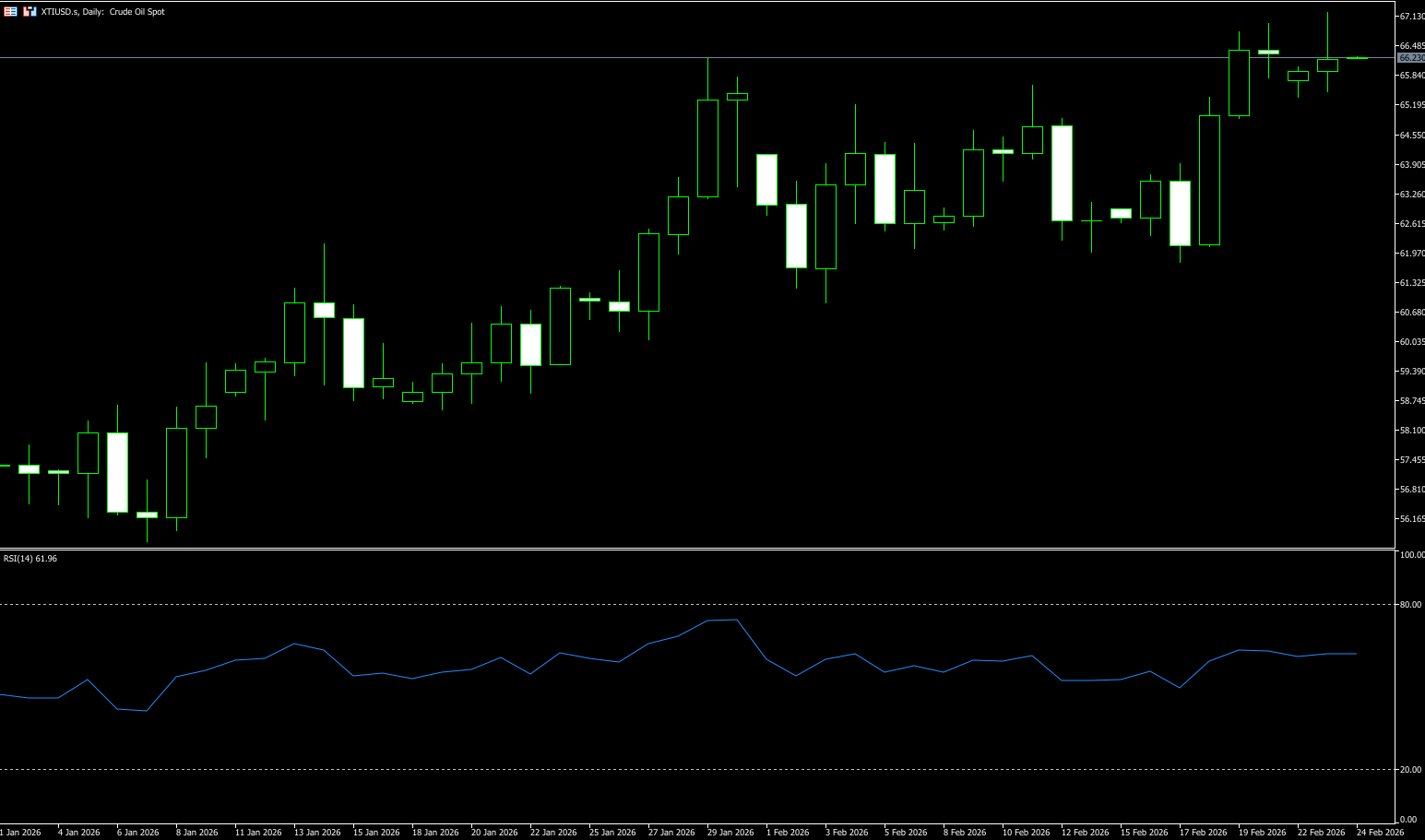 Short-term WTI oil prices are complex, with profit-taking pushing a slight decline. The bullish hammer candlestick pattern on the chart failed to hold, indicating increased divergence in investment strategies and weakening bullish momentum, highly consistent with the current mixed bullish and bearish sentiment. Current oil prices are hovering around the late January high of $65.50-$66.00, with the RSI in the 60-65 range, indicating a high probability of a short-term pullback. The daily close broke below the year-end high of $65.24 (January 29th high) and the psychological level of $65.00, suggesting large-scale position liquidation and a potential period of price adjustment. Coupled with long-term oversupply pressure, the pullback could extend to the 14-day ($64.21) and 20-day ($64.06) moving averages. If geopolitical conflicts erupt or the Strait of Hormuz is blocked, oil prices could quickly break through the $68.37 (July 14th high of last year) and the psychological level of $70.00. If geopolitical risks escalate further, a test of the $71.56 (March 2019 high) area cannot be ruled out.