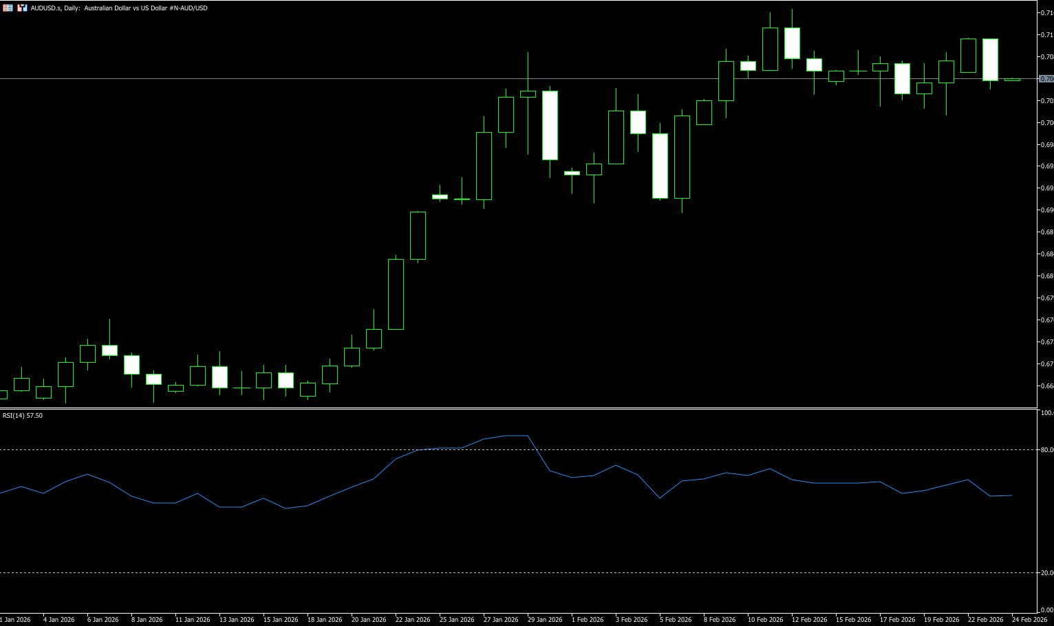 The Austrlian dollar/US dollar pair extended its gains in Asian trading on Monday, trading above 0.7100 at one point. The pair strengthened amid a weaker US dollar against major currencies due to persistent uncertainty surrounding trade tariffs. Trade policy uncertainty remains high after US President Trump criticized the Supreme Court for blocking his use of emergency powers to impose so-called reciprocal tariffs. However, gains in AUD/USD may be limited as tensions escalate between the US and Iran. Larger-scale attacks could be considered in the coming months if diplomatic efforts or initial targeted US strikes fail to persuade Iran to abandon its nuclear program. Meanwhile, the Australian dollar was supported by rising expectations of a hawkish outlook for the Reserve Bank of Australia (RBA). Stronger domestic data and robust guidance from policymakers have reinforced market expectations that the RBA may maintain a tightening bias to address persistent inflationary pressures.
