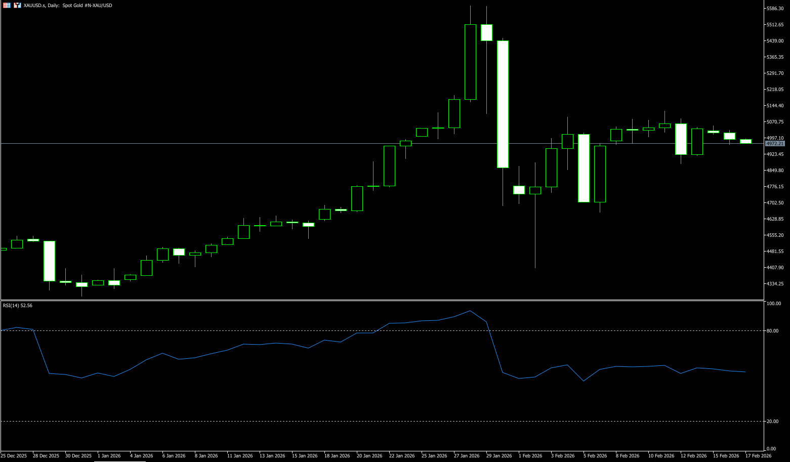 From a technical perspective, the 4-hour chart for gold prices shows a downside bias. The 20-period simple moving average (SMMA), after a steady rise, is beginning to flatten and remains above the slower 100-period and 200-period SMMAs. The price is below the 20 and 100-period SMMAs, providing resistance in the $5,012.10 - $5,049.90 range, while the $4,800 (psychological level) and the 200-period SMMA at $4,769.00 provide dynamic support. Meanwhile, technical indicators have sharply turned bearish, moving almost vertically into negative territory, reflecting increasing selling pressure. On the daily chart, gold prices briefly broke above the bullish 20-day SMMA before recovering above it, but remain close, currently at the SMMA at $4,952.00. Longer-term moving averages remain well below shorter-term moving averages and have not yet shown correlation, but still maintain an upward trend. Finally, the momentum indicator is crossing its midline, and the Relative Strength Index (RSI) has also turned downwards, currently at 53, both suggesting potential lower lows in the future.