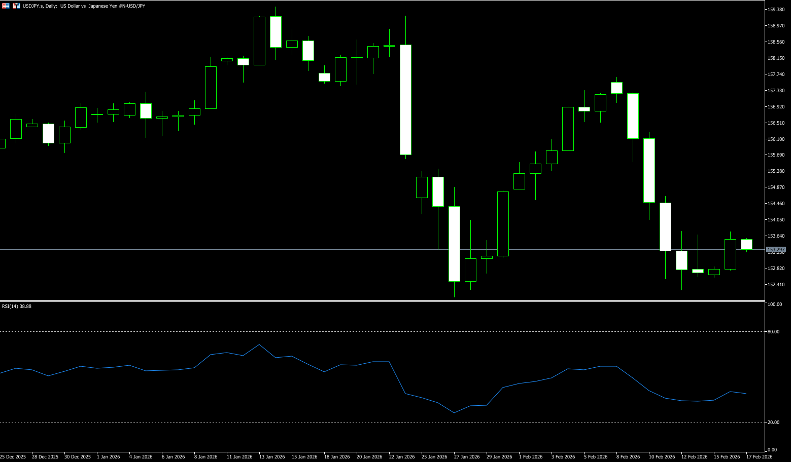 From a technical perspective, the short-term outlook for USD/JPY has turned bearish after the pair broke below its key daily moving average. Momentum indicators also remain weak. The Relative Strength Index (RSI) is hovering around 30-35, in bearish territory, indicating room for further declines, while the currency pair is not yet deeply oversold. On the downside, a clear break below 152.00 would expose the 200-day simple moving average near 150.55. A decisive break below the 200-day moving average would strengthen the bearish bias and open the door to a deeper corrective pullback towards the psychological level of 150. Measuring from the low of 152.23 to the high of 159.05, the 78.6% Fibonacci retracement level is at 153.69, and the 61.8% retracement level is at 154.84, representing a key short-term resistance area to watch during any rally. The 100-day simple moving average near 154.66 also acts as an important intermediate resistance level within this area.