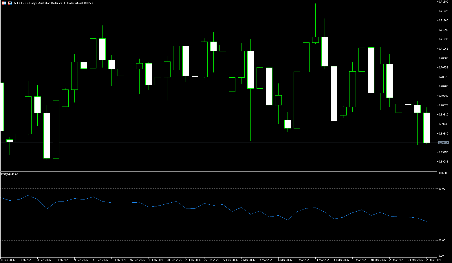 The Australian dollar edged down slightly below 0.7000 against the US dollar on Wednesday, near a two-week low, as caution prevailed over US President Trump's efforts to end the conflict with Iran, while investors weighed weak domestic inflation data. Consumer prices were flat in February, while annual inflation slowed to 3.7% from 3.8%, slightly below expectations. Core inflation also came in below forecasts, suggesting a gradual easing of core pressures. However, inflation remains above the central bank's 2-3% target range, leaving the policy outlook uncertain. The market views the likelihood of another rate hike in May as flat, while pricing in approximately 65 basis points of additional tightening for the remainder of 2026. Meanwhile, reports indicate the US is negotiating with Iran, including a proposed one-month ceasefire and a 15-point plan to resolve the conflict. However, the deployment of US ground troops to the region suggests the risk of escalation remains.