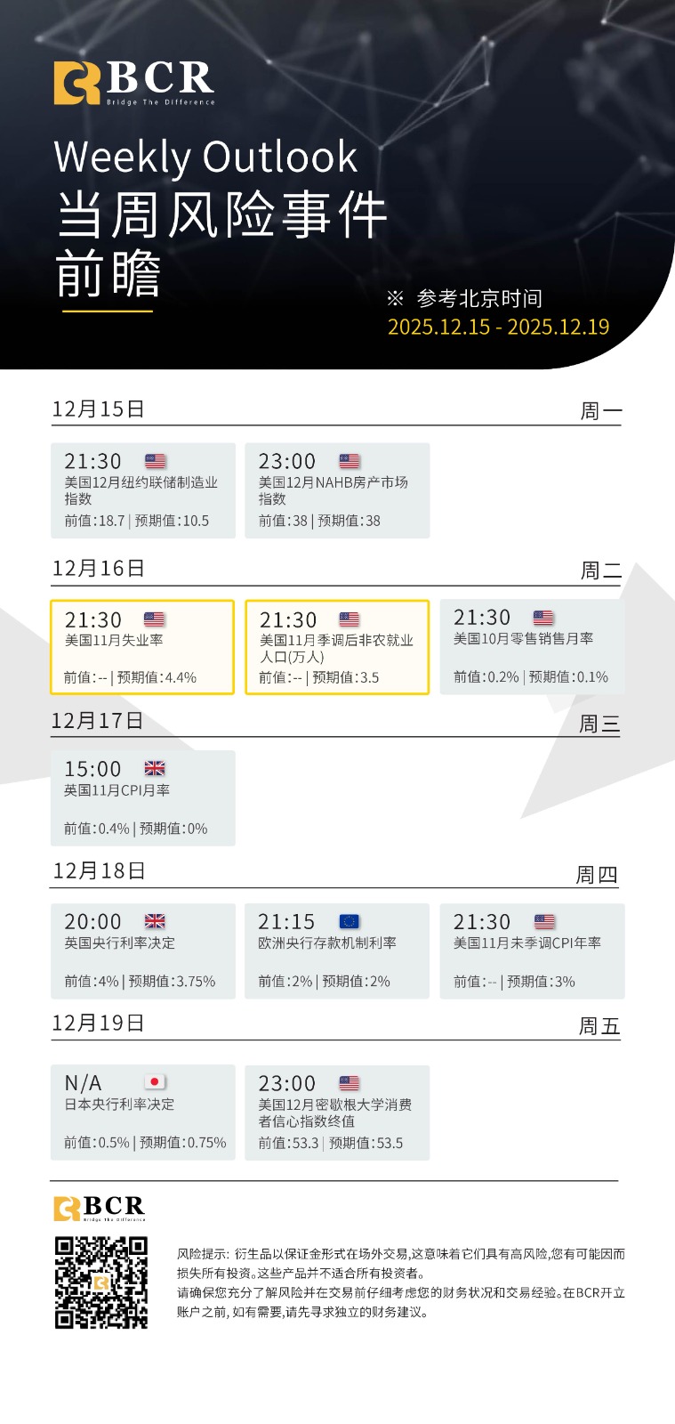 每周风险事件前瞻 : 12 月 15 日—12 月 19 日