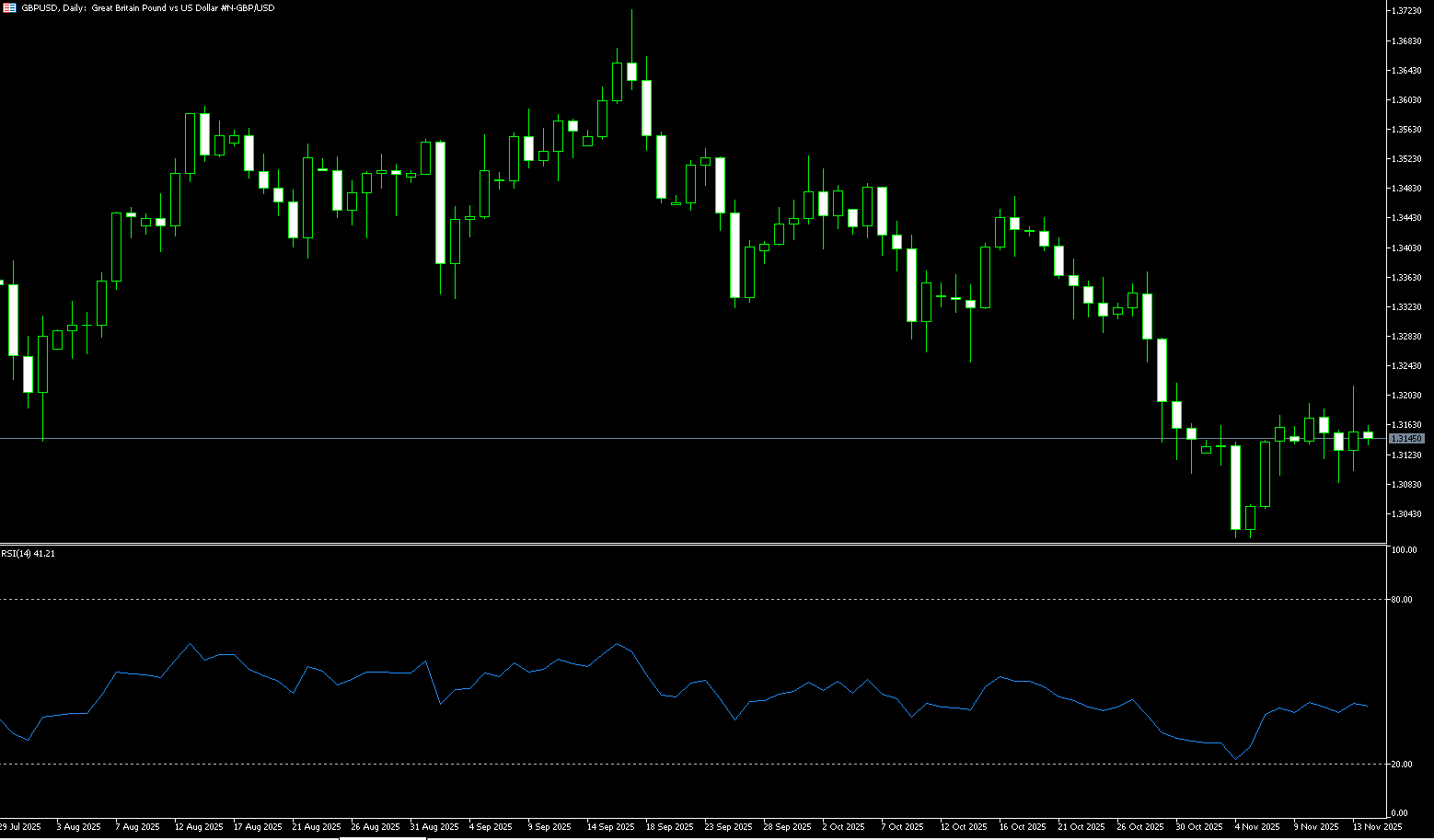 Xu hướng giảm hiện tại của đồng bảng so với đô la chủ yếu bị kìm hãm bởi hai yếu tố: dữ liệu kinh tế Anh tiếp tục yếu và kỳ vọng cắt giảm lãi suất Mỹ co lại đáng kể. Nếu dữ liệu lạm phát Anh tiếp tục giảm như kỳ vọng, đồng bảng giảm thêm gần như không thể tránh khỏi. Cần chú ý liệu mức tâm lý 1.3000 và vùng 1.3010 (mức thấp ngày 4 tháng Mười Một) có bị phá vỡ hay không. Hướng trung hạn phụ thuộc vào việc Ngân hàng Anh có đưa ra tín hiệu chuyển hướng chính sách rõ ràng vào tháng Mười Hai hay không. Biểu đồ hàng ngày cho thấy đồng bảng/đô la duy trì cấu trúc yếu và biến động. Tỷ giá đã đóng cửa thấp hơn nhiều ngày liên tiếp, giao dịch dưới các đường trung bình ngắn hạn, cho thấy áp lực bán đáng kể phía trên. Về kỹ thuật, RSI 14 ngày ở vùng trung lập đến yếu (mới nhất tại 40.57), không cho thấy dấu hiệu đảo chiều; histogram MACD đang dần co lại, gợi ý động lượng giảm vẫn đang được giải phóng. Hỗ trợ chính nằm trong phạm vi 1.3010-1.3000. Một phá vỡ dưới vùng này có thể dẫn đến giảm thêm hướng tới 1.2966 (mức thấp ngày 11 tháng Tư), và có khả năng thậm chí dưới 1.2900. Kháng cự ban đầu gần 1.3148 (đường trung bình động đơn giản 20 ngày), tiếp theo là 1.3200 (mức tâm lý) và vùng 1.3215 (mức cao ngày 13 tháng Mười Một). Tổng thể, cấu trúc biểu đồ ngày yếu, duy trì áp lực giảm trong ngắn hạn.