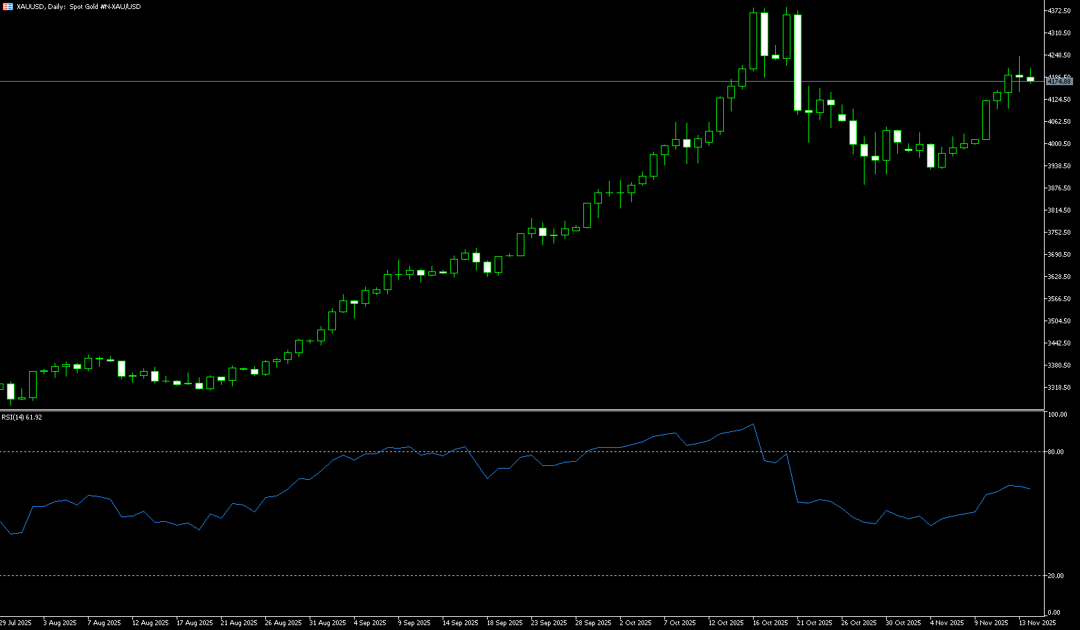 Giá vàng tuần trước có lúc giảm dưới mức tâm lý 4,000 USD xuống 3,998 USD trước khi phục hồi và dao động trên 4,000 USD/ounce. Dự kiến giảm nhẹ hàng tuần khi kỳ vọng cắt giảm lãi suất Fed tháng Mười Hai đã yếu đi sau khi báo cáo việc làm được công bố. Báo cáo cho thấy bảng lương phi nông nghiệp tháng Chín tăng 119,000 việc làm, vượt xa kỳ vọng 50,000. Những dữ liệu này củng cố đánh giá tháng Mười của Cục Dự trữ Liên bang rằng thị trường lao động đang nguội nhưng vẫn ổn định. Trong khi đó, tỷ lệ thất nghiệp tăng lên 4.4%, mức cao nhất kể từ tháng Mười 2021. Báo cáo lợi nhuận mạnh của Nvidia đã cải thiện đáng kể tâm lý rủi ro thị trường toàn cầu, thúc đẩy phục hồi thị trường chứng khoán toàn cầu và chuyển dòng tiền khỏi vàng như một tài sản trú ẩn an toàn. Tài sản trú ẩn an toàn và cổ phiếu rủi ro ảnh hưởng lẫn nhau; khi cổ phiếu công nghệ Mỹ và cổ phiếu vàng cùng giảm, một trong hai có khả năng quá đà. Ngược lại, khi cổ phiếu công nghệ đảo chiều giảm sau khi chứng minh câu chuyện AI thực sự mang lại tăng trưởng lợi nhuận nhanh, vàng bắt đầu trả lại phần lợi nhuận từ nửa đầu tuần trước. Hơn nữa, đồng đô la Mỹ mạnh lên so với hầu hết các đồng tiền chính khiến vàng định giá bằng đô la trở nên đắt hơn đối với người mua nước ngoài, càng kìm hãm nhu cầu vàng. Dù vàng, với tư cách tài sản trú ẩn truyền thống, đã tăng 55% trong năm nay và đạt kỷ lục 4,381 USD ngày 20 tháng Mười, thị trường gần đây đã thể hiện xu hướng củng cố.