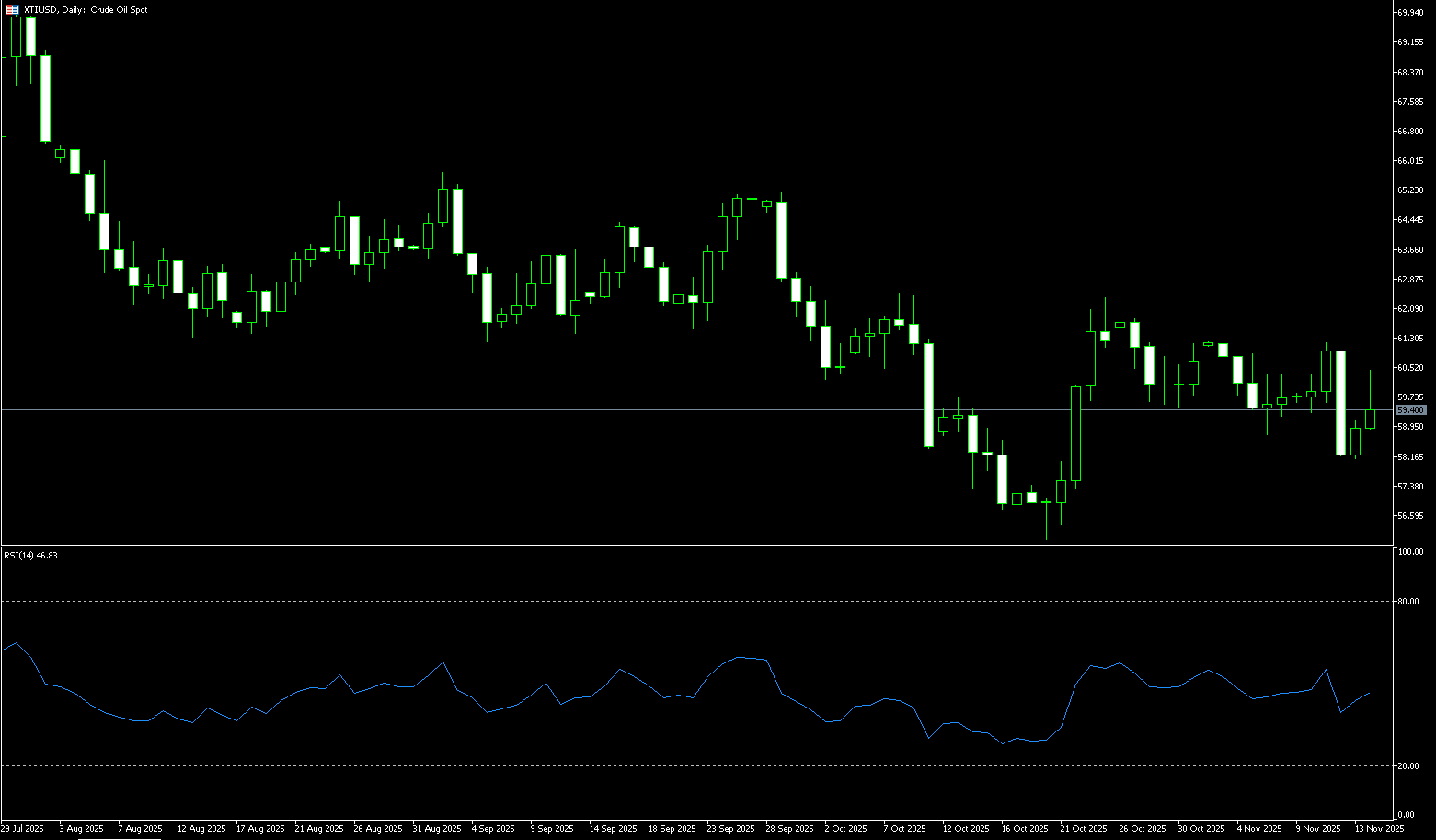 Biểu đồ hàng ngày cho thấy giá dầu thô WTI đã trải qua hai lần giảm nhanh liên tiếp vượt 3% trong tám ngày giao dịch qua (ngày 12 và 19 tháng Mười Một). Các chỉ báo kỹ thuật bao gồm Chỉ số Sức mạnh Tương đối (RSI) 14 ngày và MACD đều ở vùng âm, cho thấy động lượng giảm mạnh và gợi ý thị trường có thể vẫn giảm trong ngắn hạn. Các yếu tố cơ bản giảm dài hạn có nghĩa là mỗi lần phục hồi có thể là cơ hội bán tốt, và đuổi theo mức cao là chiến lược thị trường không khôn ngoan. Hiện tại, các mức hỗ trợ chính vẫn ở 58.02 USD (dải Bollinger dưới) và 58.00 USD (mức tâm lý), hình thành vùng hỗ trợ ban đầu. Một phá vỡ dưới 58.00-58.02 USD có thể càng củng cố động lượng giảm đến mức thấp ngày 22 tháng Mười tại 57.31 USD. Cuối cùng, mức thấp tháng Mười tại 55.97 USD sẽ lại trở thành tâm điểm thị trường. Vùng kháng cự đầu tiên ở 59.80 USD (dải Bollinger giữa) và 60.00 USD (mức tâm lý). Giá dầu cần lấy lại mức kháng cự đã nêu để có khả năng thử đường trung bình động đơn giản 55 ngày tại 60.81 USD. Một phá vỡ trên mức này sẽ củng cố thiên kiến tăng ngắn hạn và đẩy giá hướng tới 61.58 USD (dải Bollinger trên). Một phá vỡ xa hơn trên mức này có thể dẫn đến phục hồi lên 62.38 USD (mức cao ngày 24 tháng Mười).