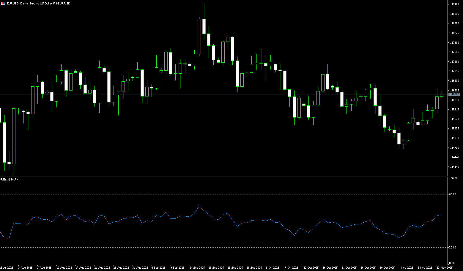 Biểu đồ ngày cho thấy đường trung bình động đơn giản 20 ngày tại 1.1560 liên tục nằm dưới đường trung bình động đơn giản 34 ngày (1.1586) và 50 ngày (1.1637), trong khi đường trung bình động đơn giản 100 ngày (1.1649) cũng đang giảm. Cặp tiền vẫn ở dưới tất cả các đường trung bình động này, duy trì thiên kiến giảm. Chỉ số Sức mạnh Tương đối (RSI) 14 ngày ở mức 40.65, phục hồi từ các mức quá bán trước đó nhưng vẫn dưới đường giữa 50. Mức thoái lui Fibonacci 23.6% đo từ mức cao 1.1918 đến mức thấp 1.1468 được xem là điều chỉnh tại 1.1574, đóng vai trò kháng cự ngay lập tức, tiếp theo là mức thoái lui 38.2% tại 1.1639. Về giảm, 1.1500 (mức tâm lý) có thể được xem là hỗ trợ tạm thời, tiếp theo là mức 1.1468 của tháng và mốc 1.1400.